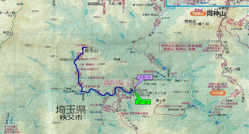 中津川・こまどり荘駐車場~鎌倉沢橋~法印ノ滝~二又分岐~(尾根コース)~南天山(往復) |