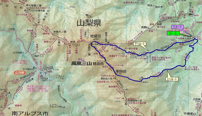 薬師岳まで: 5時間20分 観音岳まで: 6時間05分 地蔵岳まで: 7時間05分 全行程 :12時間05分 |
