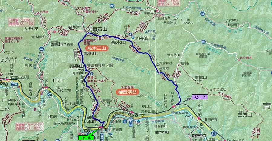 高水山まで :1時間30分 岩茸石山まで:2時間05分 惣岳山まで :2時間45分 全行程 :4時間00分 |