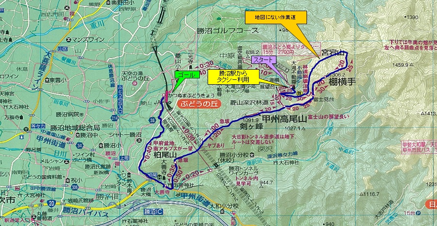 大滝不動尊~宮宕山~棚横手~富士見台~甲州高尾山~柏尾山~五所神社~ 勝沼ぶどう郷駅 |