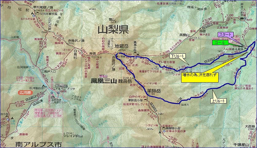 青木鉱泉~(中道)~薬師岳~観音岳~地蔵岳~(ドントコ沢) ~青木鉱泉 |
