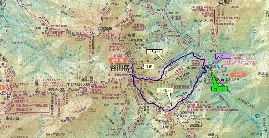 谷川岳ロープウェイ駐車場~(巌剛新道)~谷川岳肩の小屋~トマノ耳とオキノ耳(往復)~谷川岳肩の小屋~(天神尾根)~(田尻尾根)~谷川岳ロープウェイ駐車場 |