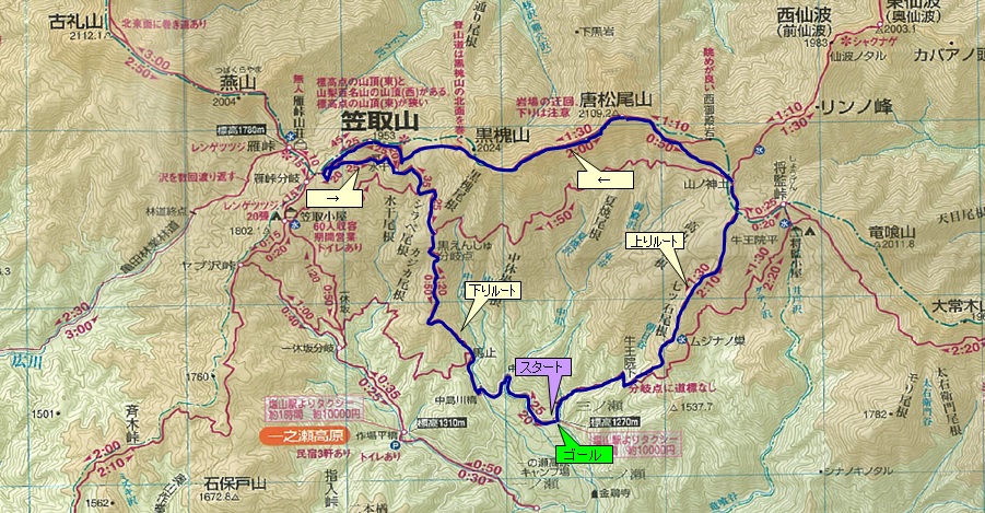 唐松尾山まで:3時間20分 笠取山まで :5時間00分 全行程 :7時間35分 |
