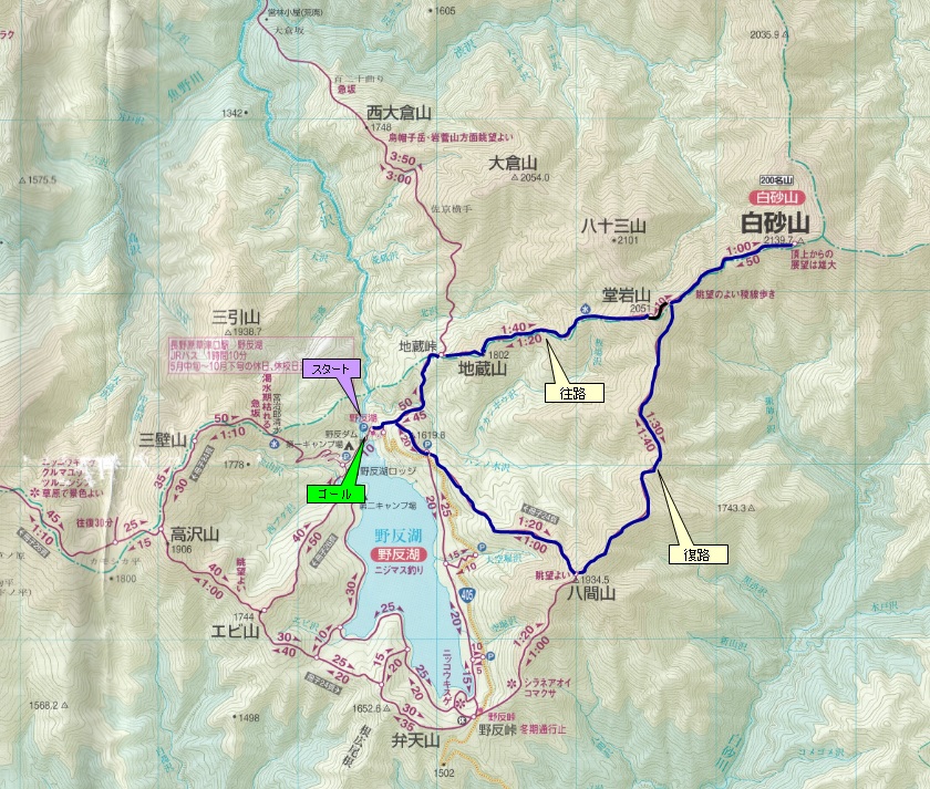 野反湖駐車場~地蔵峠~堂岩山~白砂山~八間山~野反湖駐車場 |