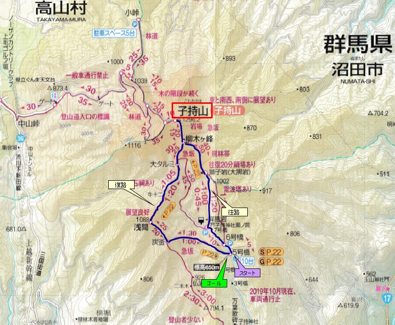 子持山まで:2時間25分 全行程 :5時間30分(屏風岩および獅子岩への往復時間を含まず) |