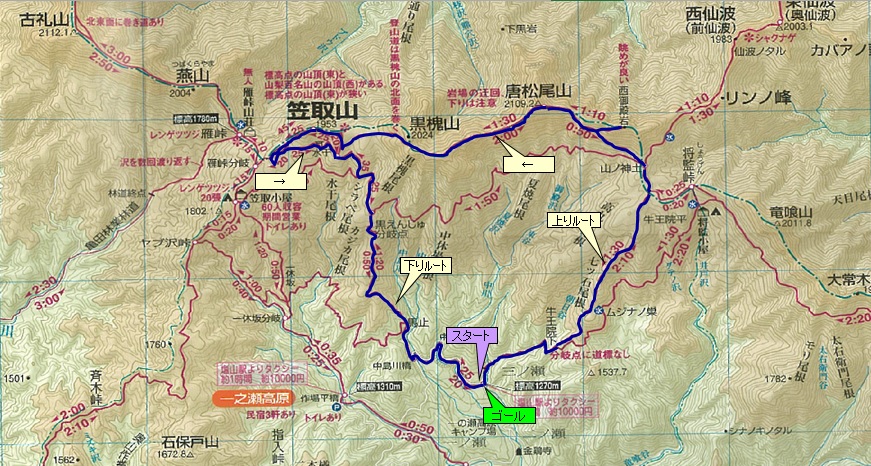 唐松尾山まで:3時間20分(西御殿岩の往復時間含まず) 笠取山まで :5時間00分 全行程 :7時間35分 |
