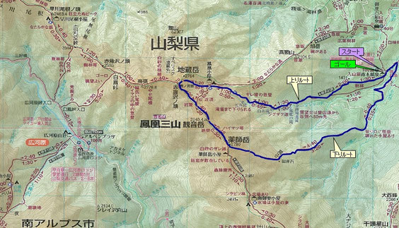 青木鉱泉~(ドンドコ沢)~地蔵岳~観音岳~薬師岳~(中道)~青木鉱泉 |