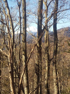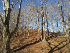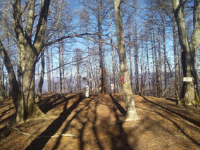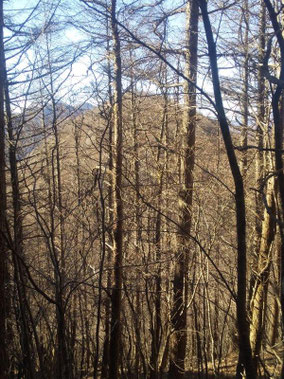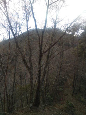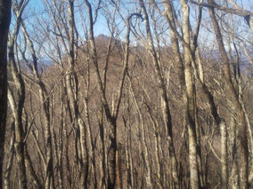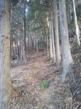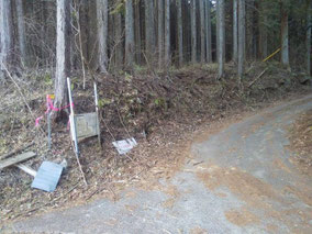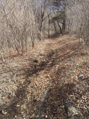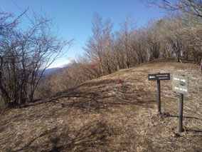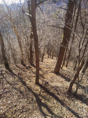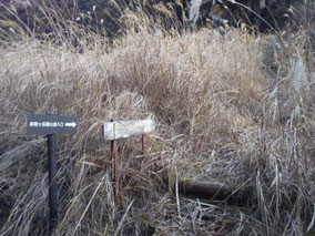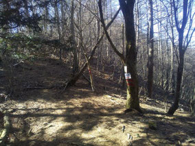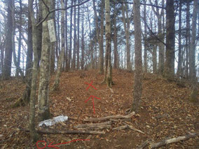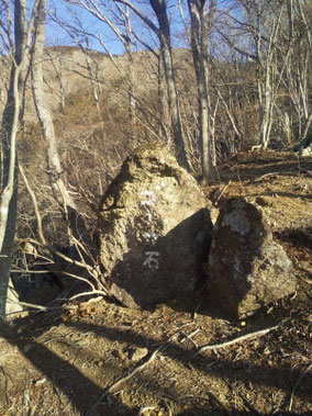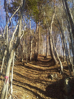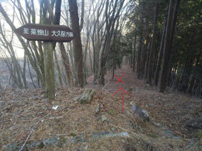 【※道迷い①】 水源の森を大栗と間違え、登山口までのルートミスでUターン 【※道迷い②】 葡萄岩ノ頭を菜畑山へ向かって約1時間ぐらい経ったところで何かヘン! 登山道はある程度整備され、木に赤ペンキやリボンもつけてあるので 問題ないと思い、そのまま樹林帯を下り続けるものの菜畑山への登り返しがこない。 時間は12:40を過ぎており、これはなんかおかしいと思い葡萄岩ノ頭まで 戻ることにしました。(◎_◎;) すると上から1組のカップル(葡萄岩ノ頭で休憩していたカップル)が下りてきたのでこのルートで間違えないのかと一応聞いてみたところ、ここは正規のルートではないらしく菜畑山へは葡萄岩ノ頭から南へ行く登山道があるとのこと。どうやら自分は西へ直進していたようだ。 因みにそのカップルの方はGPSを頼りに道なき道を行っているようでした。そこで睡魔と疲労でヘトヘトになりながらもダッシュで葡萄岩ノ頭を目指しました。 なんとか13:00過ぎに到着し、改めて地図で確認すると、確かに左方向に 直角に曲がっておりました。 確認せずにそのまま勢いよく直進してしまったのが痛恨のミス(反省) 【※道迷い③】 大久保方面道標にて大久保方面の行き先があったのでR413へのショートカットかと思い下ったものの途中で登山道が消滅してしまった。
