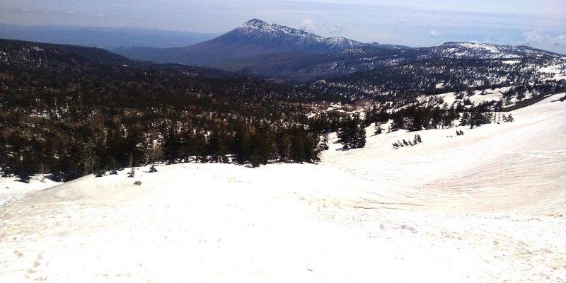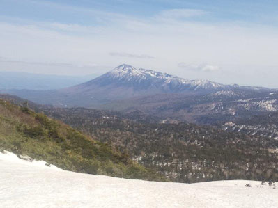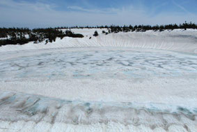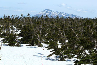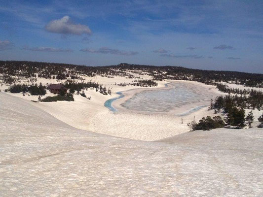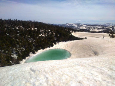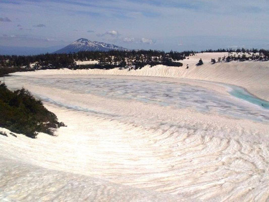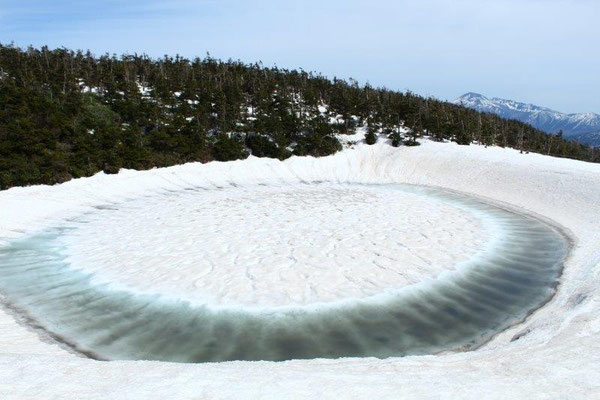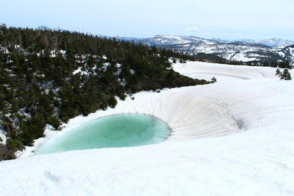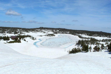 山頂近くにある鏡沼(直径約50m)は、5月後半から6月初旬にかけて、雪が溶けると全体が巨大な「目玉」のように見える雪解けの季節にだけ見られる現象